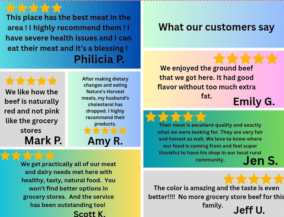 Here at Nature's Harvest Market, we have wide selection of products for you to choose from and are dedicated to adding more products in the future. We are proud to offer real, natural products grown and raised on pastures in Juniata County, Pennsylvania.Â