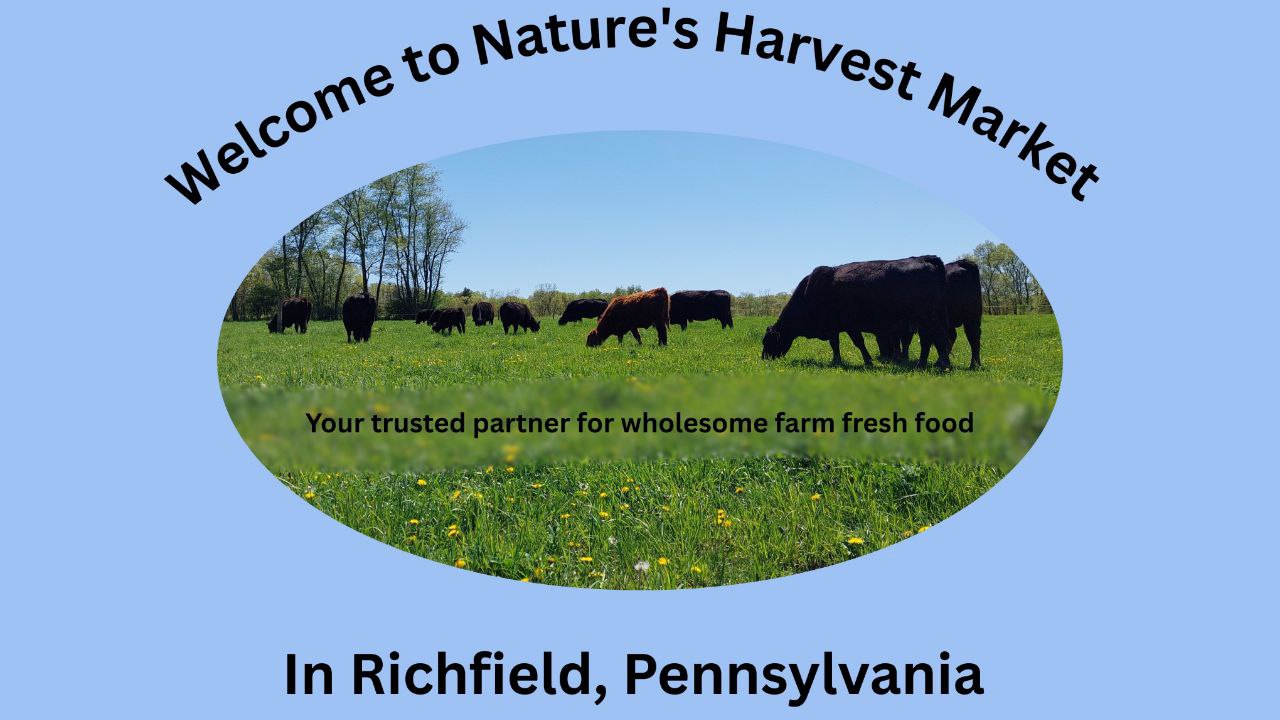 Here at Nature's Harvest Market, we have wide selection of products for you to choose from and are dedicated to adding more products in the future. We are proud to offer real, natural products grown and raised on pastures in Juniata County, Pennsylvania.Â